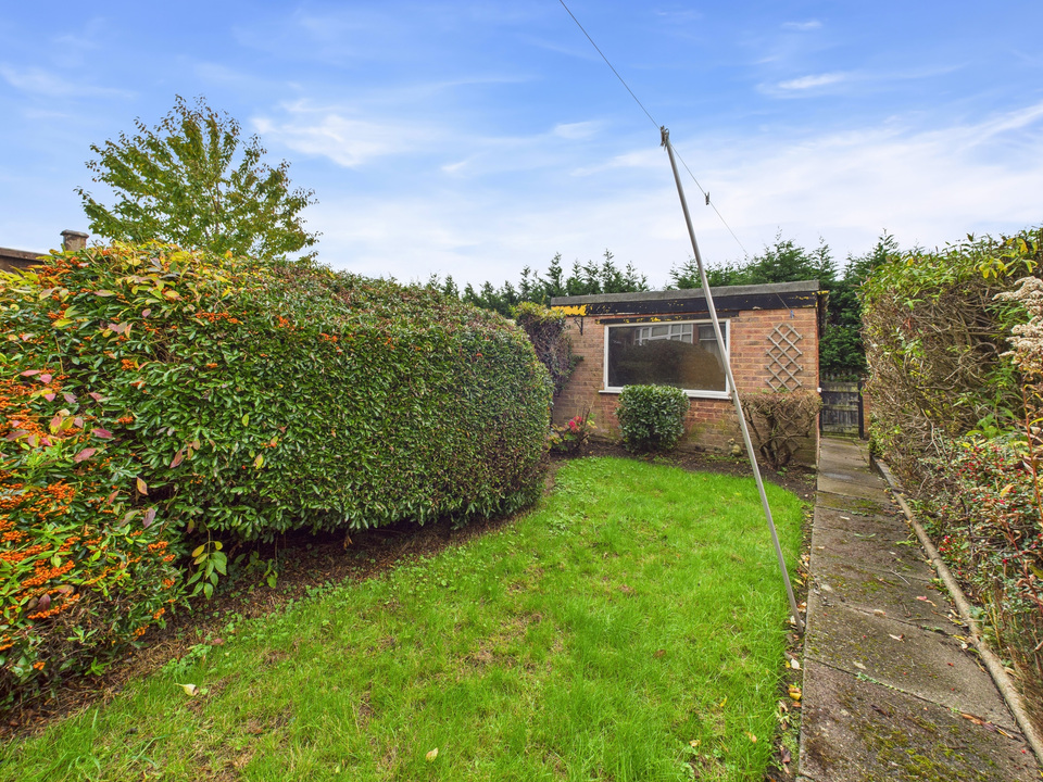 Outside, the private, low-maintenance garden leads to a detached garage, offering secure parking or additional storage.