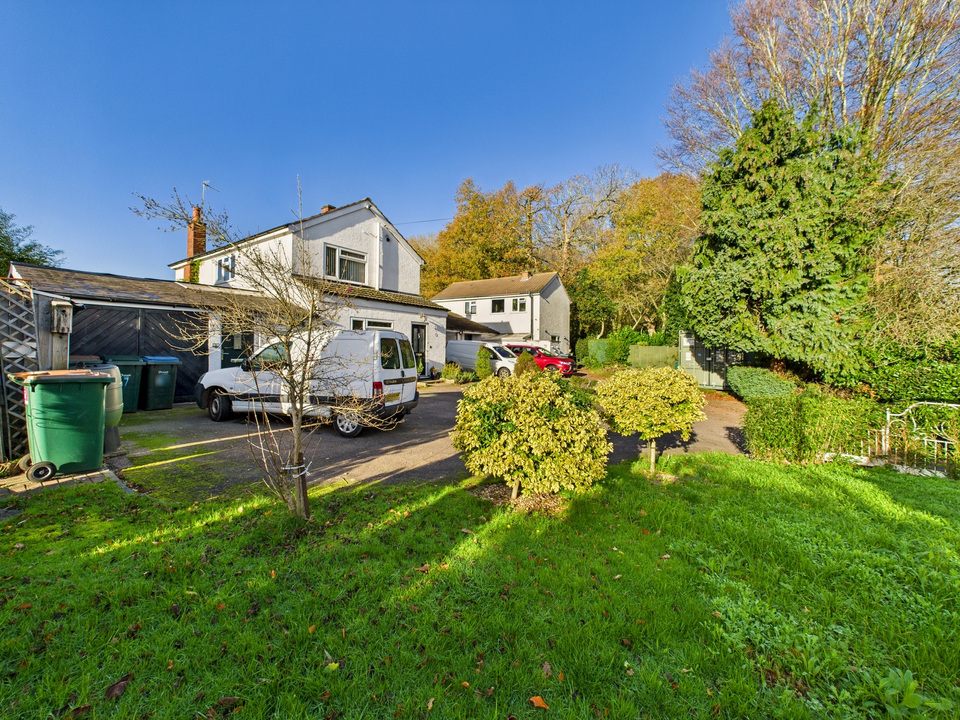 Set on a substantial plot, the property is approached via a private driveway shared with one neighbouring home. The broad frontage includes a lawned garden, plentiful parking, and direct access to the garage, creating an impressive welcome before you step inside.