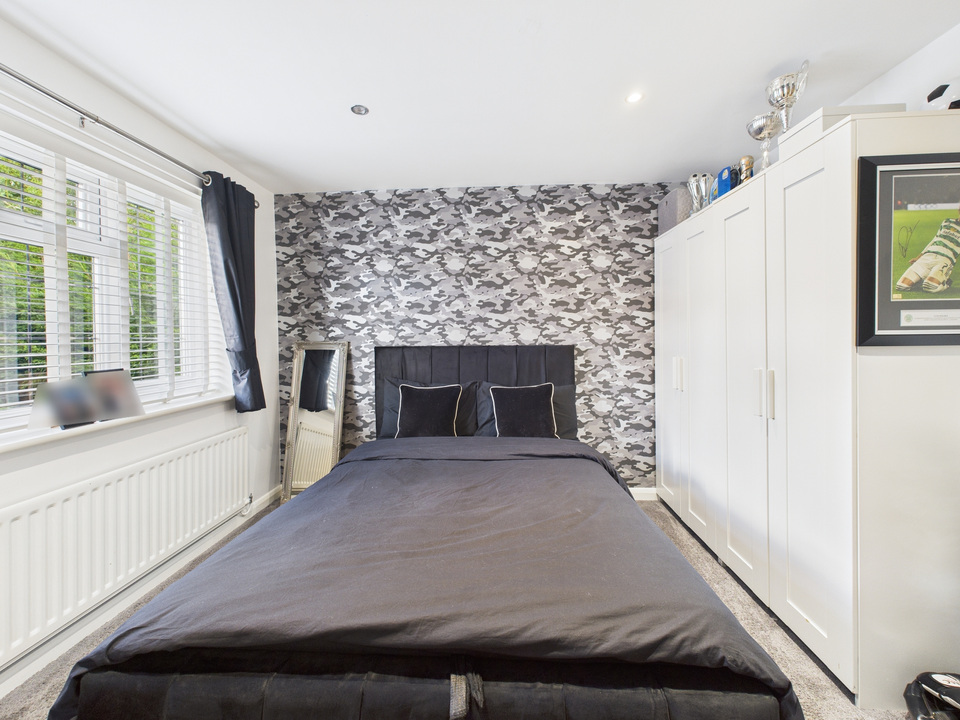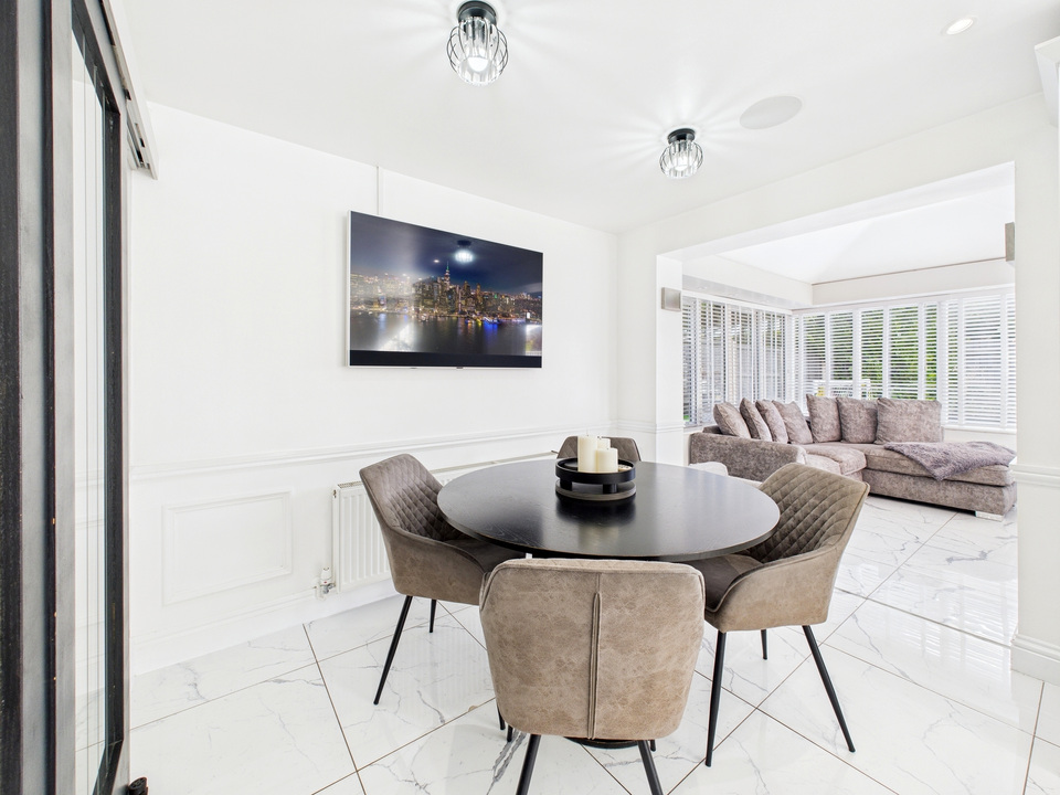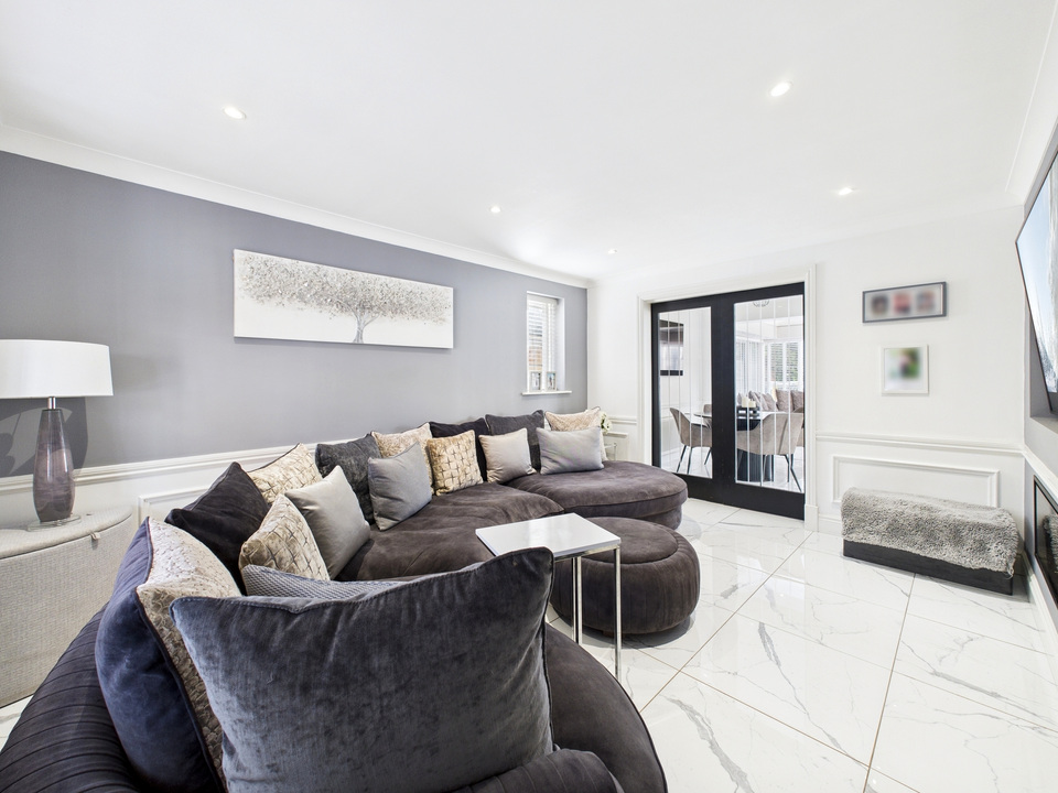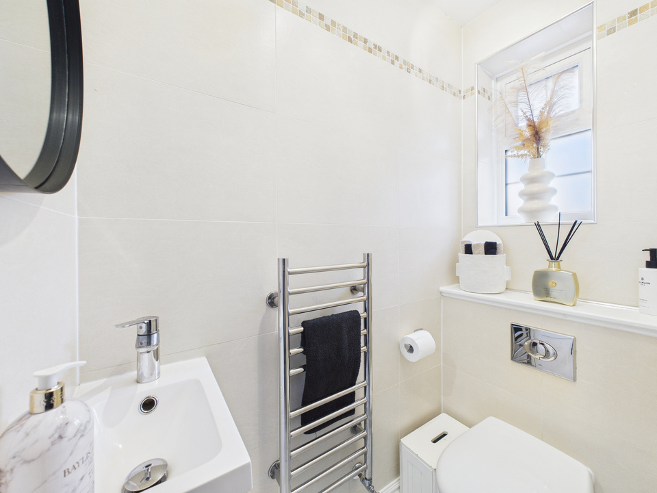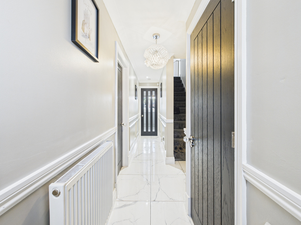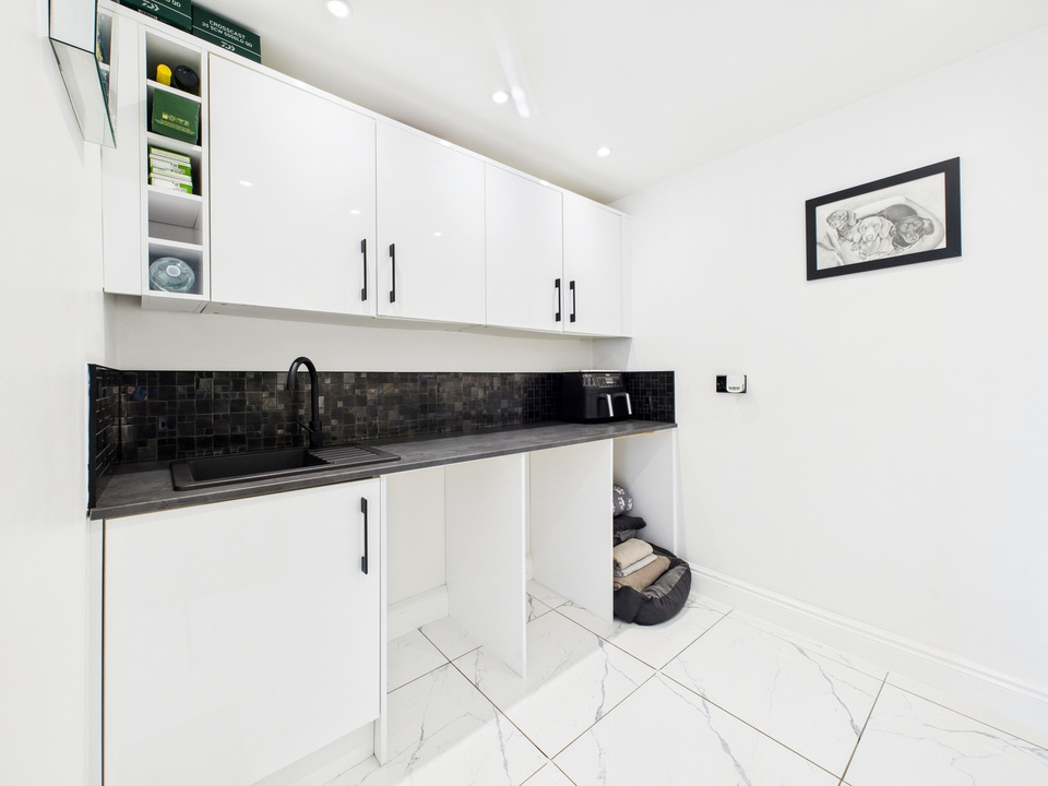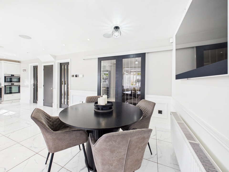 The ground floor offers a welcoming living room and a convenient downstairs WC before opening up into the heart of the home – a spacious kitchen, dining and living area. The kitchen is fitted with high-quality units and appliances and is complemented by a large separate utility room and a handy storage cupboard under the stairs. The entire downstairs is finished with sleek tiling that flows seamlessly from room to room, enhanced by striking black doors for a stylish finish.