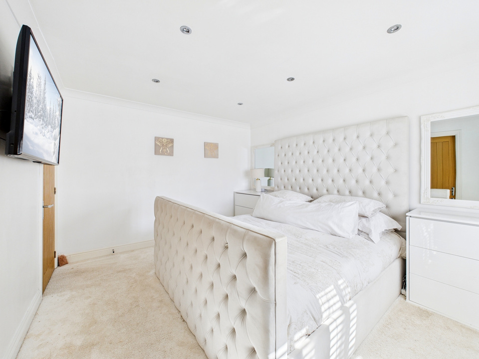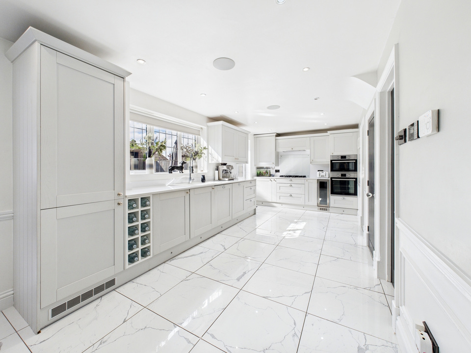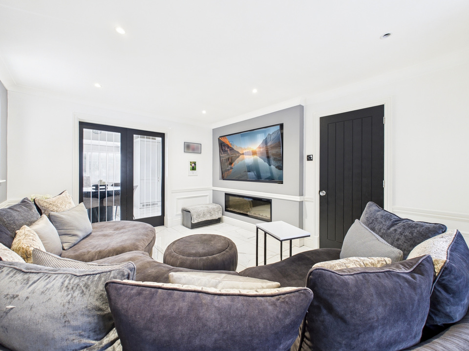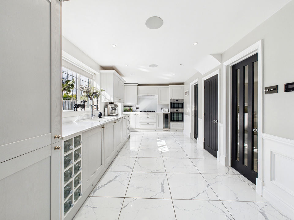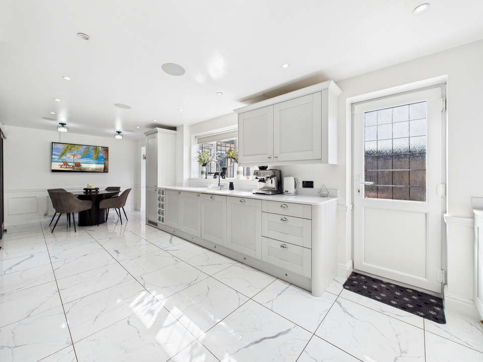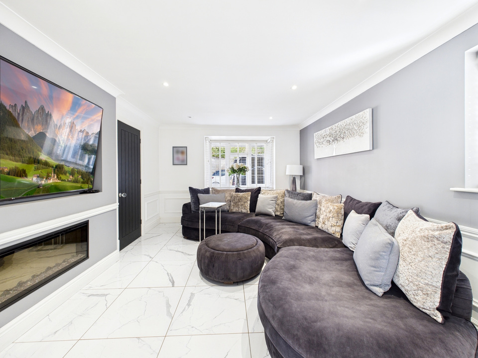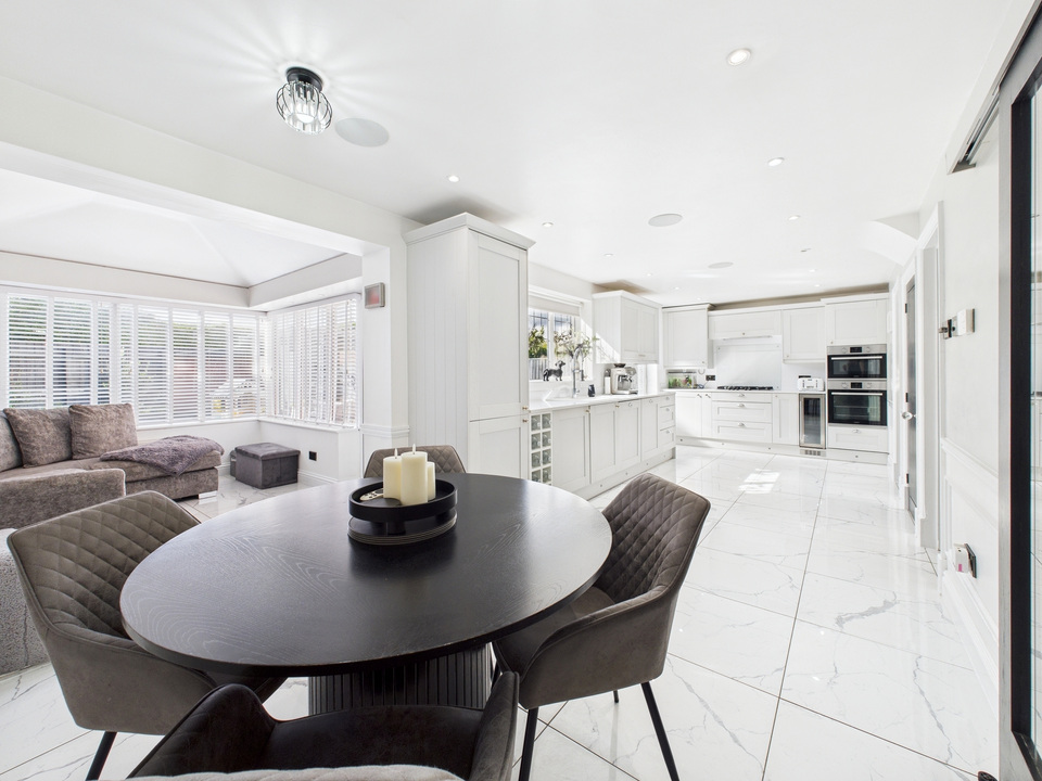 The ground floor offers a welcoming living room and a convenient downstairs WC before opening up into the heart of the home – a spacious kitchen, dining and living area. The kitchen is fitted with high-quality units and appliances and is complemented by a large separate utility room and a handy storage cupboard under the stairs. The entire downstairs is finished with sleek tiling that flows seamlessly from room to room, enhanced by striking black doors for a stylish finish.