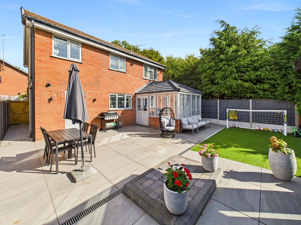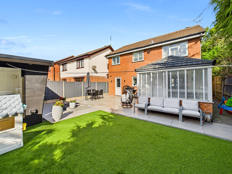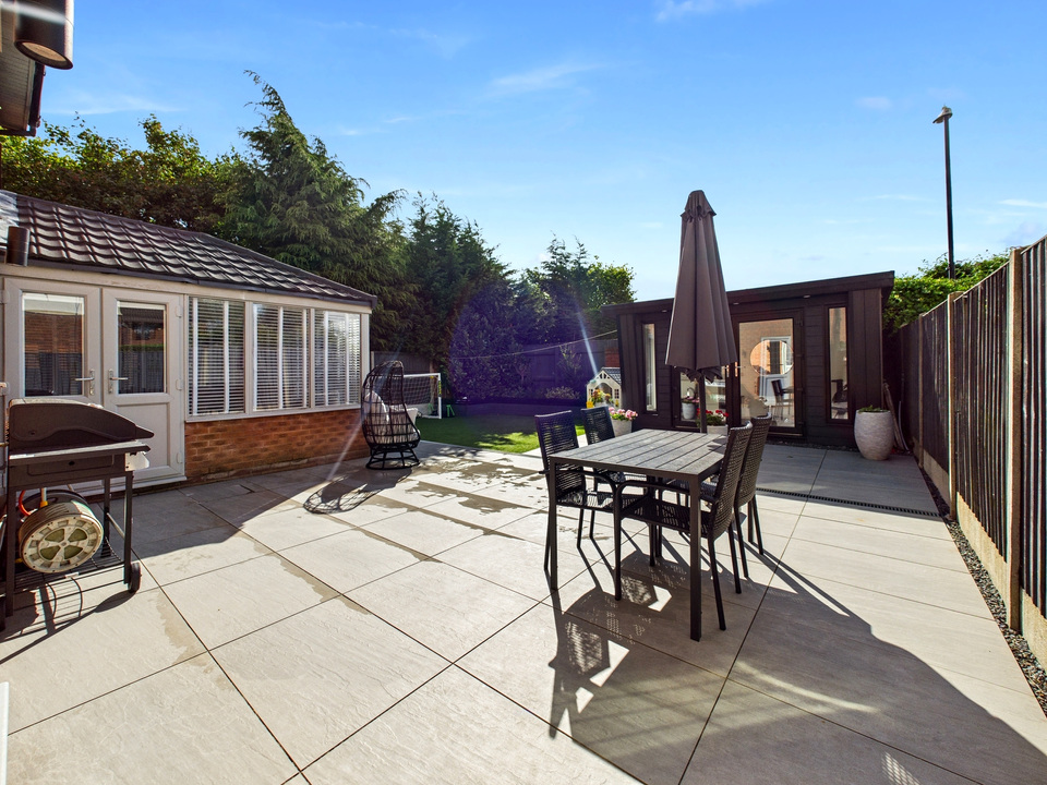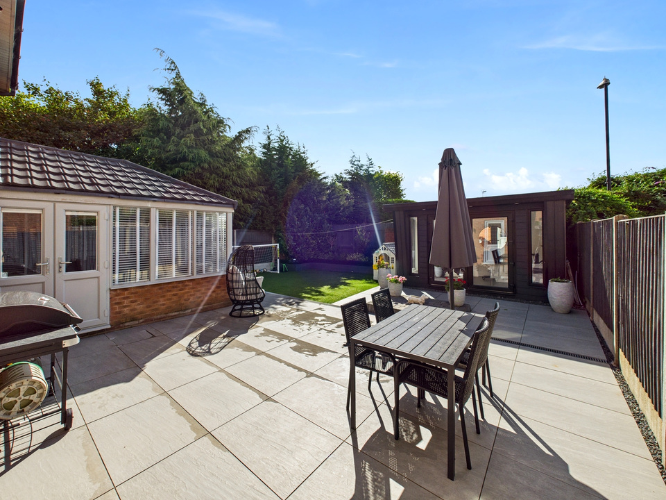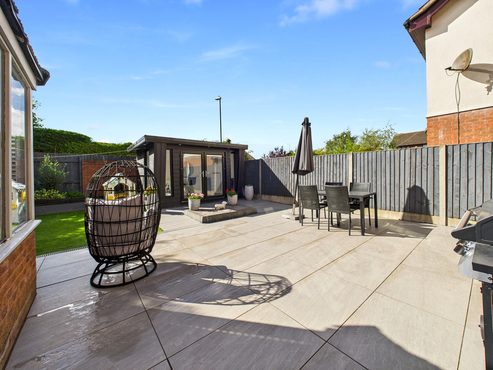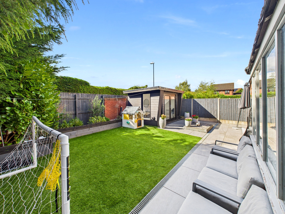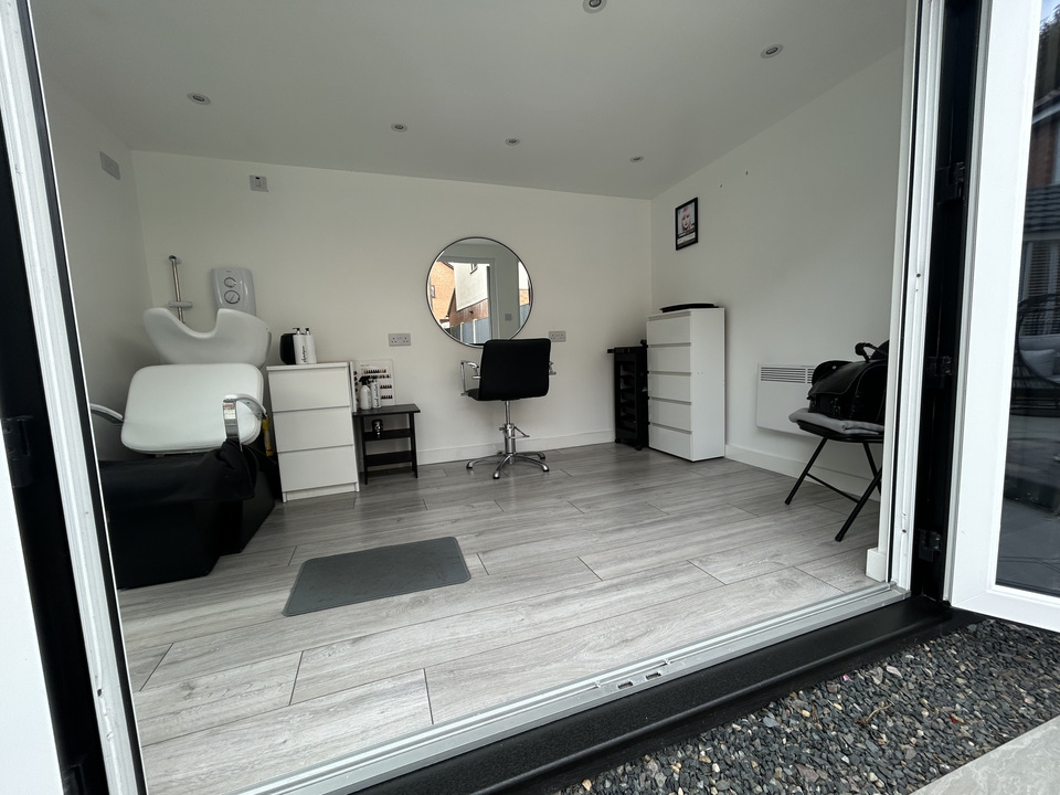 Outside, the low-maintenance garden features astroturf and a patio area, ideal for relaxing or entertaining. An outdoor room, currently used as a salon, adds a versatile extra space that can be tailored to suit your needs.