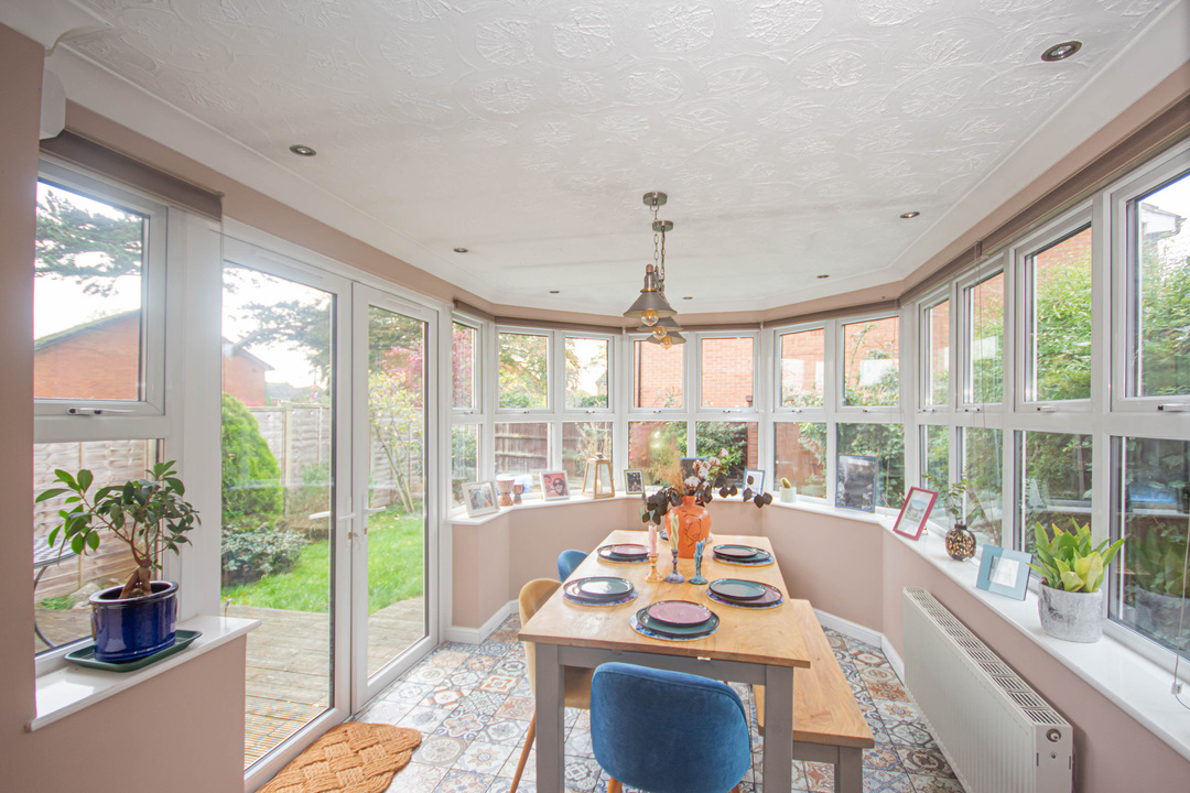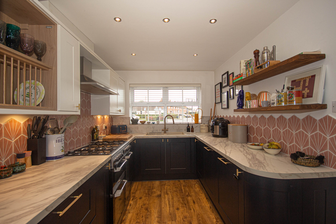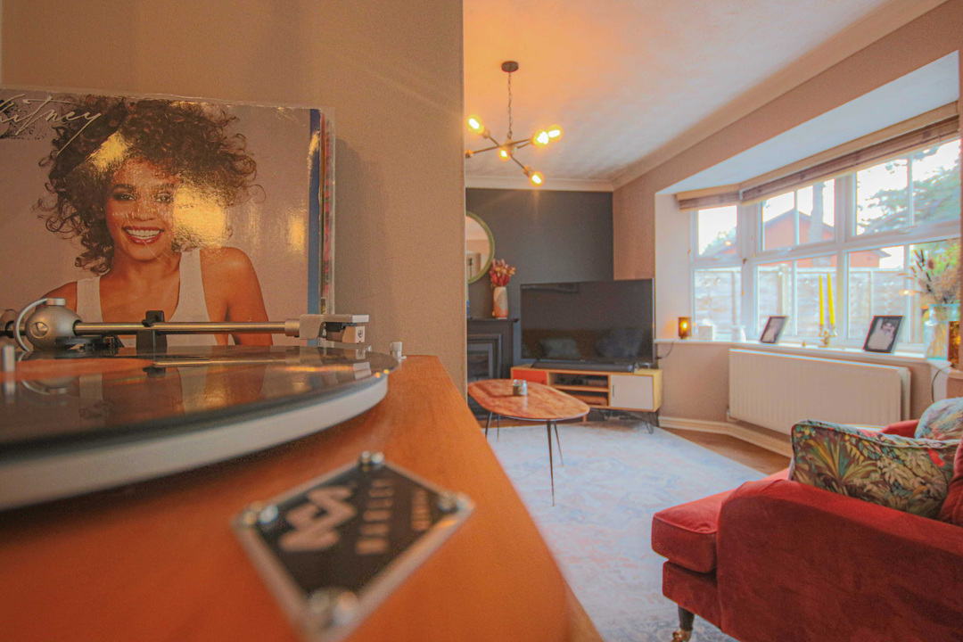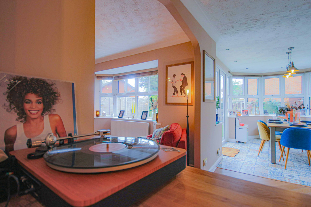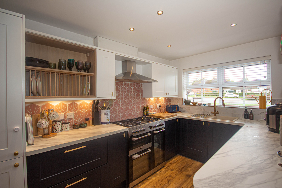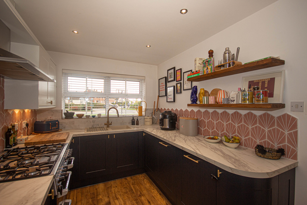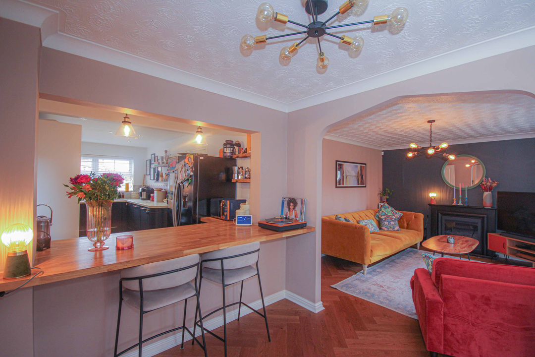 Inside, the welcoming entrance hallway features quirky print porcelain floor tiles, bespoke under-stair shoe storage, and a modern downstairs WC. The ground floor has been carefully designed for contemporary living, with a large, newly renovated kitchen that flows beautifully into the open-plan lounge and dining area. The breakfast bar overlooks the kitchen, creating a wonderful sociable layout — perfect for entertaining, family life, or working from home.
