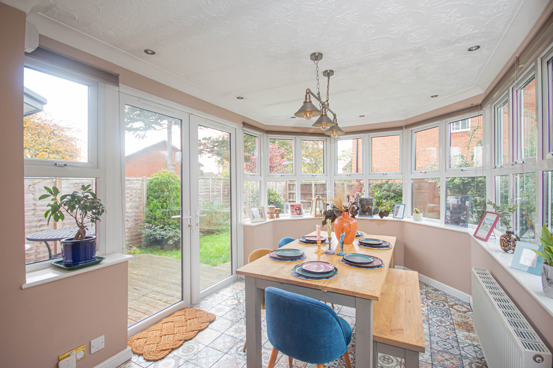 The kitchen includes a range of integrated and freestanding appliances, hidden bin storage, and a boiling hot/filtered cold water tap. A side door offers easy access to the front, rear, or side of the property, while patio doors from the dining area open directly to the rear garden.