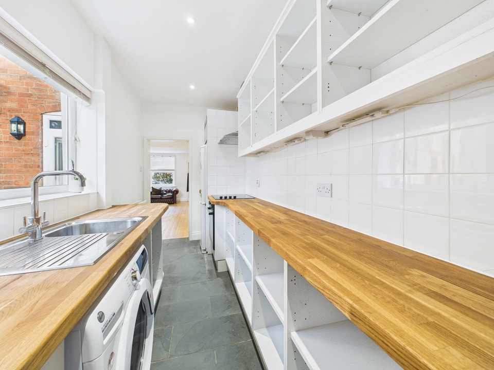 The open-plan living area is flooded with natural light, showcasing original floorboards and providing seamless access to a modern kitchen complete with solid oak worktops. A convenient downstairs WC completes the ground floor.